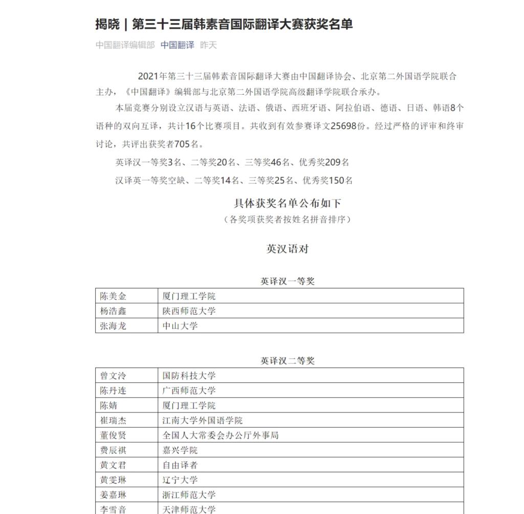 由中国翻译协会、北京第二365英国上市官网在线联合主办,《中国翻译》编辑部与北京第二365英国上市官网在线高级翻译学院联合承办的2021年第三十三届韩素音国际翻译大赛,获奖结果近日揭晓。365英国官网2018级英语(创新实验班)专业本科生杨浩鑫在大赛中表现优异,荣获英译汉一等奖。