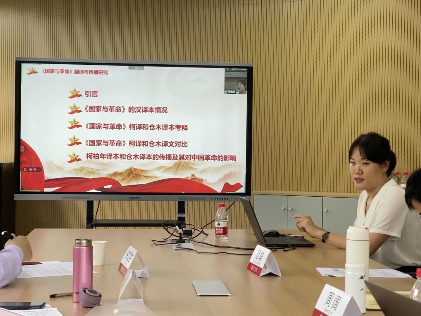 主旨发言后,与会者分成两个小组,围绕“共产主义与翻译”、“马列主义文献研究”、“习近平新时代中国特色社会主义思想的外译”等议题展开讨论。在导师陶源老师的指导下,周阔在发言中梳理了《国家与革命》的61个汉译本,并以柯柏年和仓木译本为例,结合列宁《国家与革命》俄语原文对柯柏年译本的误译现象进行了研究。根据两译本传播主体、传播时代背景及传播对象的不同,分析两译本在翻译质量差异的情况下,均产生了较强传播效果的原因。在各分会场,与会者纷纷发表自己的学术研究成果与见解,并与主持人及现场听众进行深度讨论与交流,现场气氛热烈。