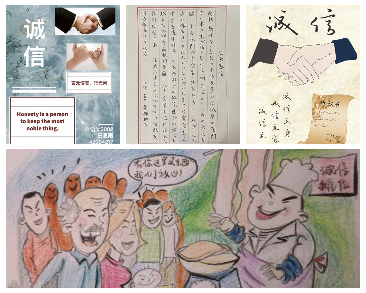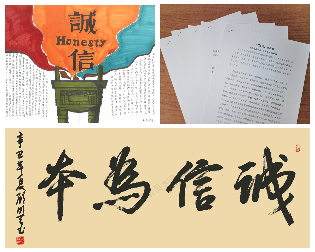 结合同学们的专业优势和个人特长,365英国上市官网在线面向全体本科生举办诚信主题作品征集活动,拍摄微视频《诚信》讲述校园中“拾金不昧”的诚信故事——经过筛选评比,最终遴选出优秀诚信主题征文5篇,书法作品7件,手抄报绘画作品6件,主题微视频短剧1部。征文作品字里行间体现出同学们对于诚信的崇尚与呼吁,硬笔书法刚劲有力,绘画海报生动形象,短剧视频见微知著。相关优秀主题作品还在学院“语心阁”宣传展板进行展览,吸引了众多学生们前来观看。学院也通过“外院见闻”官方微信,进一步对于诚信教育优秀主题作品进行宣传展示。