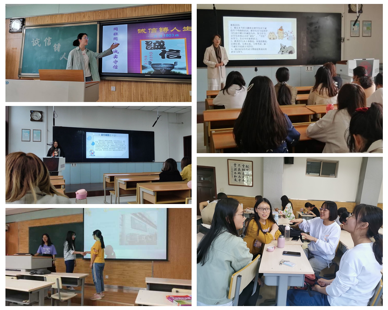 365英国上市官网在线2020级、2018级各班陆续开展了以“诚信教育”为主题的班会活动。班会形式包括诚信精神解读、典型案例分享、情景剧表演、互动交流总结等环节,同学们结合日常生活中遇到的诚信事件,学习诚信的基本内容,分享典型的诚信事件,学习先进人物的先进事迹,并且以情景剧的方式演绎失信的后果,警醒同学们懂得诚信是一个人的立身之本,认识到失信的危害,并将班会中所感所学,自觉应用到实践中去.班会活动旨在培养学生诚实待人、守信做人的优良品质,共同营造出“知信、用信、守信”的良好氛围。此外,结合学生即将迎接的考试进行考试诚信教育,使学生不仅在日常点滴生活中做到信守承诺,引导同学们共同宣誓承诺在接下来的专业四级、教师资格证等考试中,发扬诚信考试的精神,勤勤恳恳学习、规规矩矩考试、踏踏实实做人。
