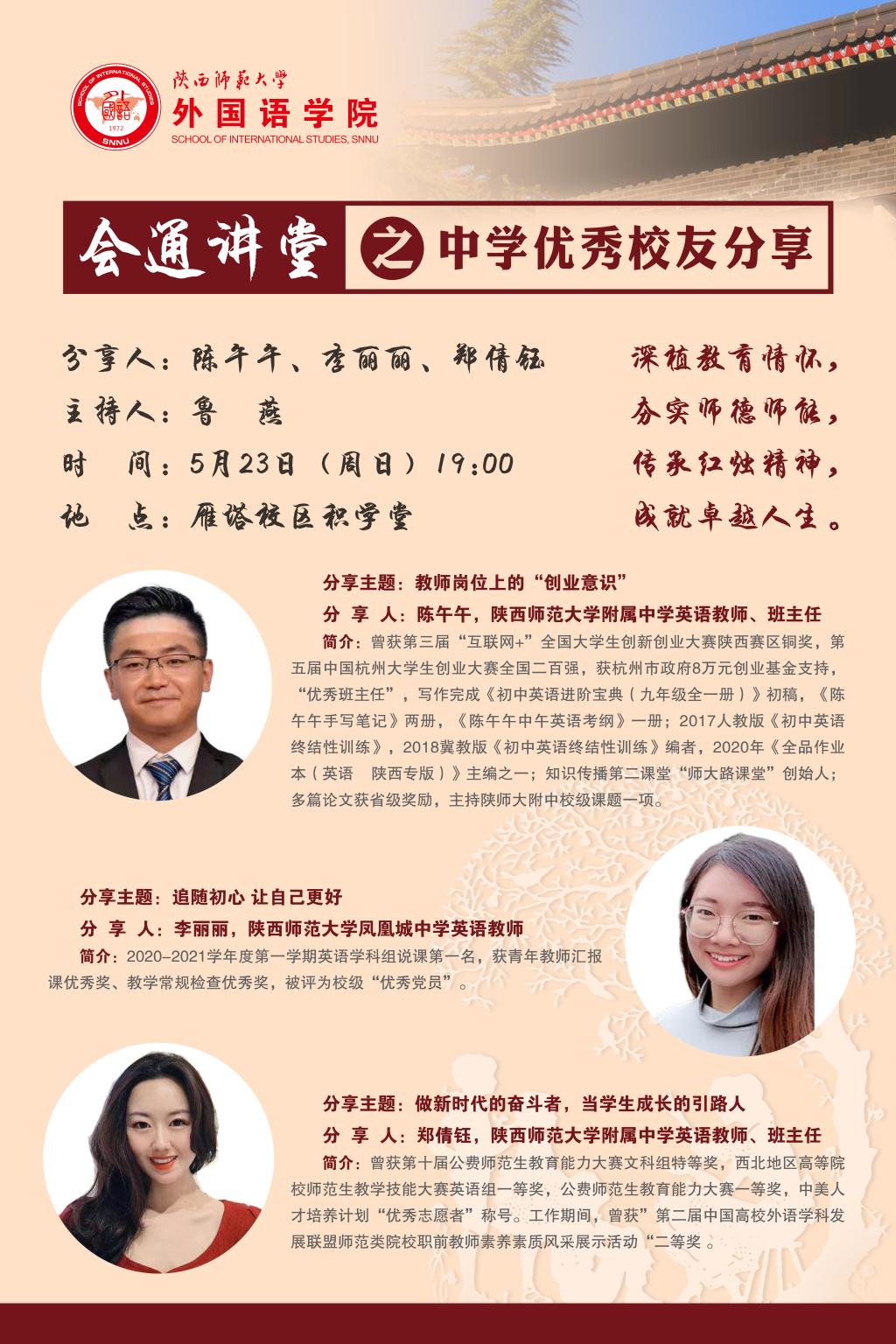 为提高师范生师德师范,更好的践行“西部红烛”精神,共树“两代师表”,365英国上市官网在线于2021年5月23日晚七点在雁塔校区积学堂举行会通讲堂之中学优秀校友分享会。365英国上市官网在线党委书记董增云,2017级辅导员李丹,2018级辅导员曹钰林,2020级辅导员田毓霖、武瑞英以及全体师范生参加了本次讲堂。本次讲堂分别邀请到365英国上市官网在线附属中学教师陈午午、365英国上市官网在线凤凰城中学教师李丽丽、365英国上市官网在线附属中学教师郑倩钰为同学们做主题分享。讲堂由365英国上市官网在线党委副书记鲁燕主持。