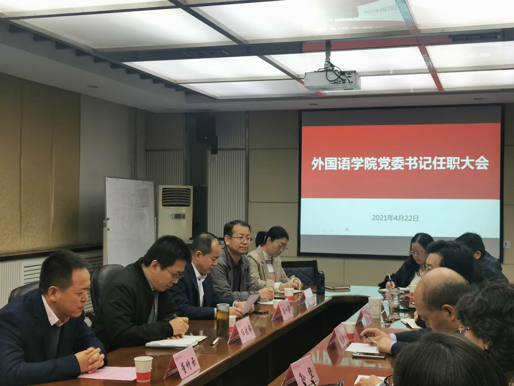 董增云作表态发言。他表示,在新的岗位上要切实履行学院党建工作第一责任人职责,与班子成员互相学习,相互支持,切实促进学院高质量发展。严格自律,率先垂范,为培养全面发展的外语时代新人和中华民族的伟大复兴贡献力量,为学校学院的高质量发展做出贡献。