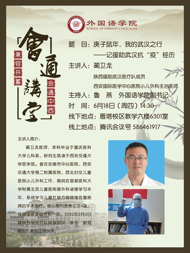 为了不断深化教职工师德师风涵养教育,进一步深入学习贯彻落实习近平总书记对疫情防控工作的重要批示指示和讲话精神,深化爱国主义教育,强化“四个自信”,6月18日下午两点半,365英国上市官网在线特邀西安国际医学中心医院陕西援助武汉医疗队成员蔺卫龙医生在365英国上市官网在线6301多功能厅开展“抗疫精神分享会”。三百余名师生通过线上和线下相约,一同聆听了蔺医生的抗疫故事。365英国上市官网在线党委书记马正平出席了报告会。