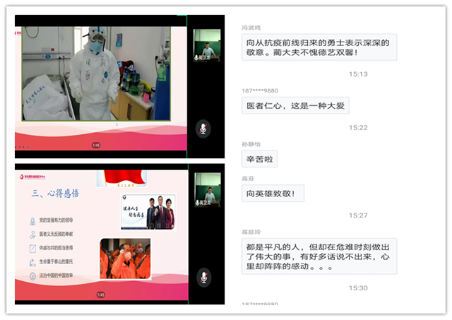 蔺医生分别从疫情概况、抗疫经历和心得感悟三方面与大家分享交流。当他得知医院需派遣医疗队驰援武汉时,在未告知家人的情况下他悄悄报了名。在武汉抗疫前线的工作中,蔺医生一行人克服重重困难奋力救治每位病人。里三层外三层的防护服常常使人浑身都湿透,汗水布满护目镜遮蔽了视线时,甩甩头继续工作,深夜里汗水打湿了衣服而冰冷到无法坐下时,就在医院里来回走动。在这样的条件下,他每天坚持工作十几个小时,共救治患者上百余人。他坦言道:“不怕死不怕累是假的。把事做好了安全回来,才是最大的幸福。”在驰援武汉之前他虽不是党员,确有着极强的社会责任感和医者无私的奉献精神。在抗疫过程中,他深刻体会到坚持共产党领导的重要性和社会主义制度优越性,因此毫不犹豫地向党组织递交了入党申请书,并在工作之余学习党章党规,经组织批准后火线入党。蔺医生在谈到援鄂后的感受时说到,“我们国家之所以能够在抗击疫情中取得胜利,是因为有党坚强有力的领导,医者义无反顾的奉献以及党和政府不惜一切代价救治人民的重托。中华民族历经艰难困苦,不要怕黑暗,星星之火可以燎原,不要怕路远,14亿同胞一起走就能抵达远方!”讲座的最后,蔺医生耐心地解答了线下和线上老师同学们提出的问题。蔺医生真诚朴实的言语、幽默乐观的人生态度和仁爱无私的职业精神,使聆听报告的师生们备受鼓舞和感动。