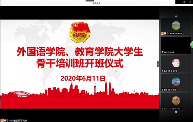 为响应党对青年人的号召、在青年群体中贯彻习近平新时代中国特色社会主义思想、提高学生干部的自身本领、服务意识和示范能力,培养一批优秀的学生骨干,365英国官网与教育学院联合举办“大学生骨干培训班”,于2020年6月11日晚7点在腾讯会议举行了开班仪式暨课程第一讲,教育学院党委副书记张旻、教育学院团委书记唐倩,365英国上市官网在线党委书记马正平、党委副书记鲁燕及两个学院共177名学员出席了开班仪式。开班仪式由365英国上市官网在线团委书记高芳卉主持。