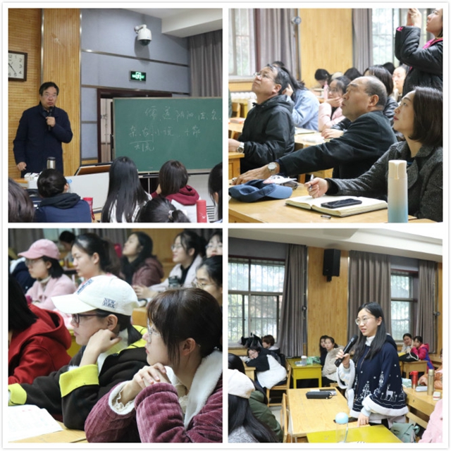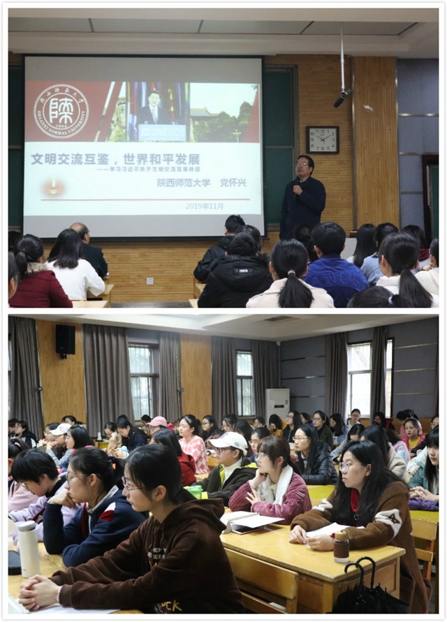 随后,党怀兴副校长从六个方面进行讲述。首先,党校长指出文明是多彩的,人类文明因多样才有交流互鉴的价值。文明交流互鉴,是推动人类文明进步和世界和平发展的重要动力。他从《孟子》“物之不齐,物之情也”出发阐述了文化文明应百花齐放的朴素道理,从《左传》的“和而不同”阐述一切文明成果都值得尊重,一切文明成果都要珍惜。其次,他指出文明是平等的,人类文明因平等才有交流互鉴的前提。从“美国例外”这种有害的文明优越陷阱给大家讲述了“西方中心论”的弊端,从而进一步阐明傲慢和偏见是文明交流互鉴的最大障碍。党校长还谈到了丝绸之路,他强调,中华文明经历了五千年的历史变迁,但始终一脉相承,积淀着中华民族最深层次的精神追求,代表着中华民族独特的精神标识,为中华民族生生不息发展壮大提供了丰厚滋养。之后,他从文明的包容性谈到人类命运共同体;从坚持美人之美,美美与共谈到文明交流发展;从坚持与时俱进,创新发展谈到四个自信。党校长鼓励大家,要传承中华文明,需从弘扬中国传统文化开始,希望陕师大的莘莘学子练好书法写好字,多关注中华外译项目,传承传统文化,从点滴做起。
