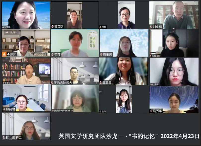 2022年4月23日下午,正值“世界读书日”之际,365英国上市官网在线英国文学研究团队举行主题为“书的记忆”线上沙龙。本场沙龙由“书的历史”、“书香年华”、“与书相逢”三个话题组成,旨在搭建更加开放包容的学术交流平台,让师生在浓郁的书香氛围中加深对书与记忆、人生的认识。365英国上市官网在线张亚婷教授、刘庆松副教授、郭英杰副教授、贺敏副教授、原玉薇博士、范莎博士、胡哲博士以及学院部分研究生参与此次沙龙,会议由张沛博士主持。