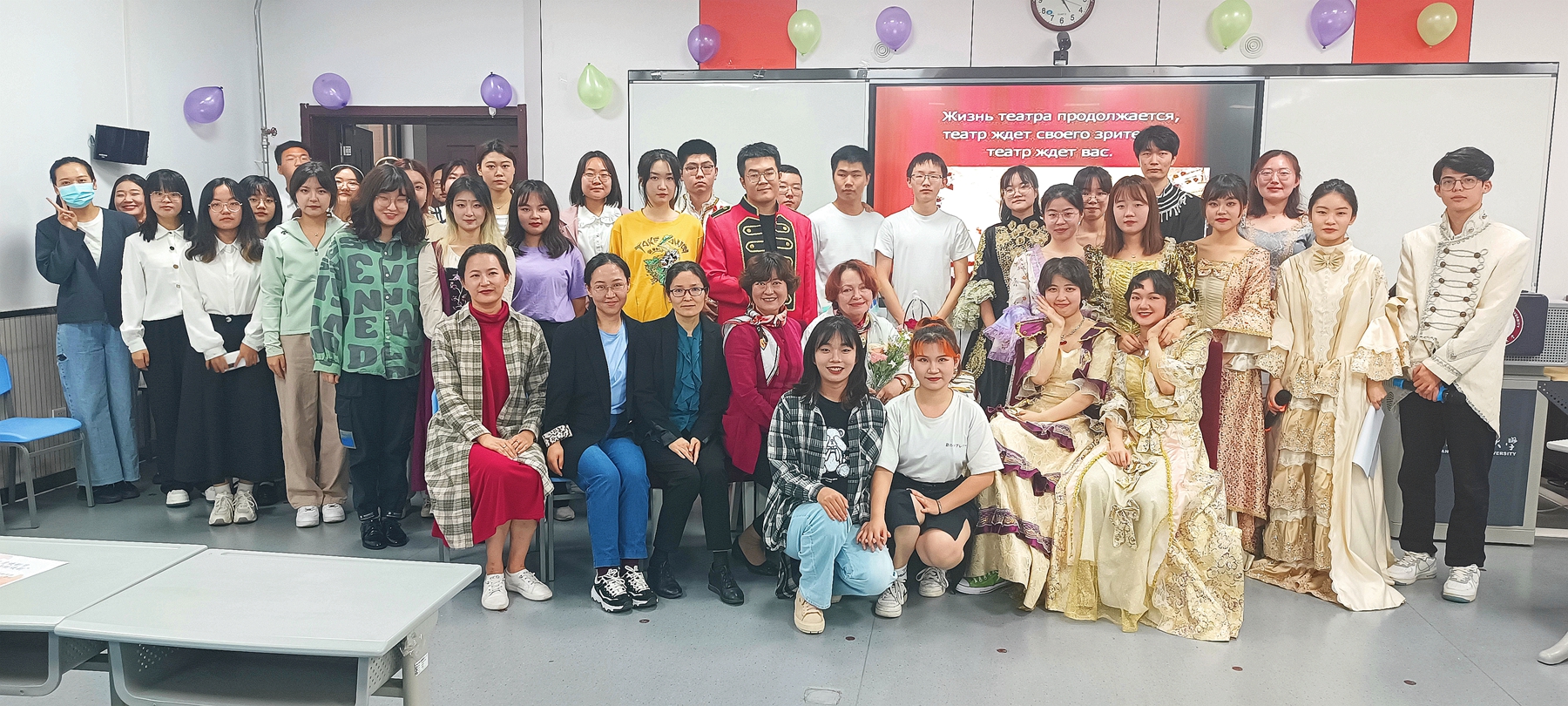 2022年5月12日下午15:30,365英国上市官网在线俄语中心、365英国官网俄语系联合举办的五月俄语戏剧沙龙活动在教学六楼6301教室顺利进行。365英国上市官网在线院长刘全国、党委副书记鲁燕、俄语系主任孟霞,副主任王翠,俄语系外籍教师娜塔莉·察廖娃,俄语系教师段李敏、唐可欣及俄语系全体学生参与了此次活动。