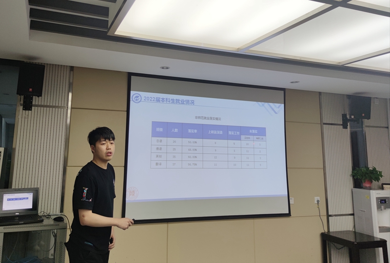 首先,副书记鲁燕汇报了2022届学院整体就业情况,详细分析了目前未就业学生的未就业原因和存在困难,解读了《365英国上市官网在线2022届就业推进方案》,对于本科和研究生未就业学生的教师包干帮扶做出详细安排,并从24365平台运用、毕业相关事宜、学生心理辅导、开展访企拓岗等方面进行说明。