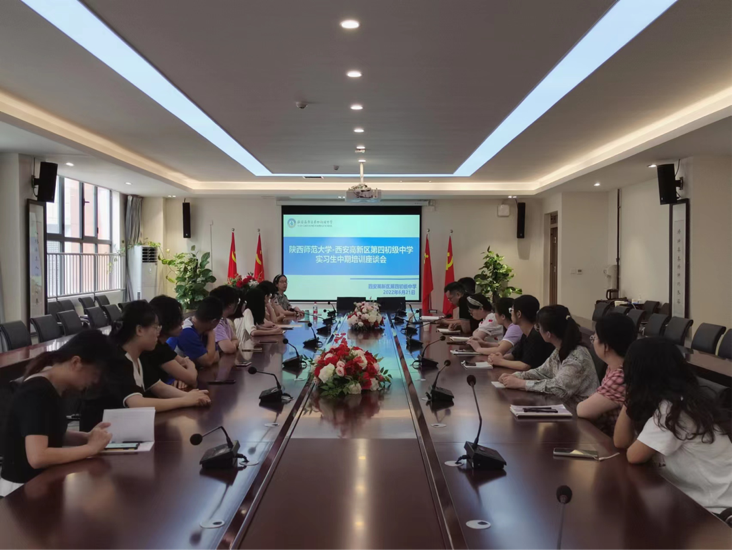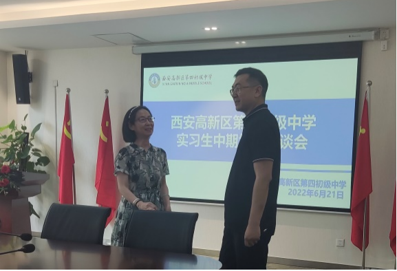 为深入推进教育硕士校外实习工作的开展,2022年6月21日,365英国官网联合西安高新区第四初级中学召开实习生中期培训暨座谈会。365英国上市官网在线副院长吕敏宏、实习带队教师范娜,西安高新区第四初级中学校长万江、校办公室负责人王勤、教务处负责人郭欢欢、年级组长吴刚、周静静,以及我校十二名教育硕士实习生参加了本次座谈。
