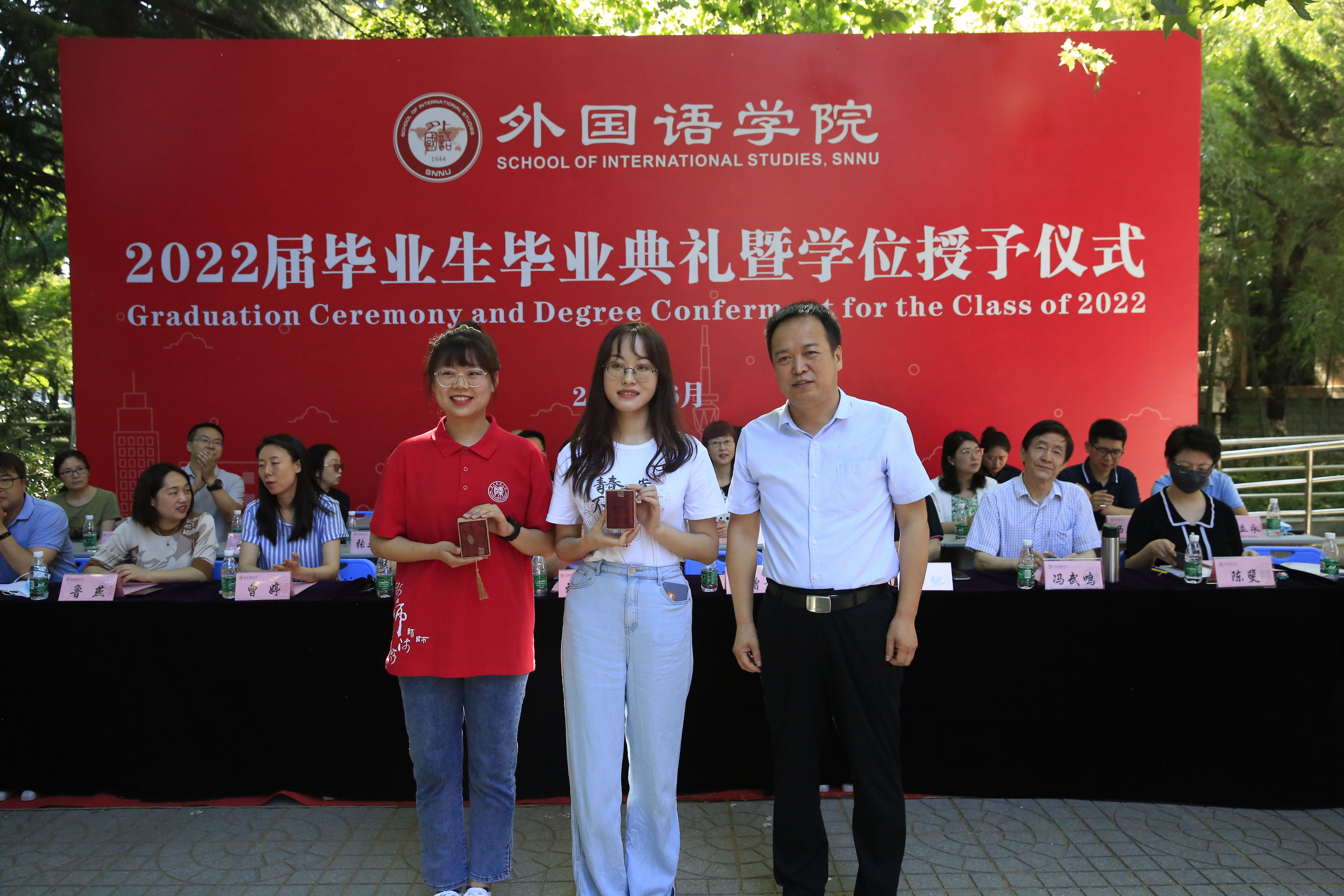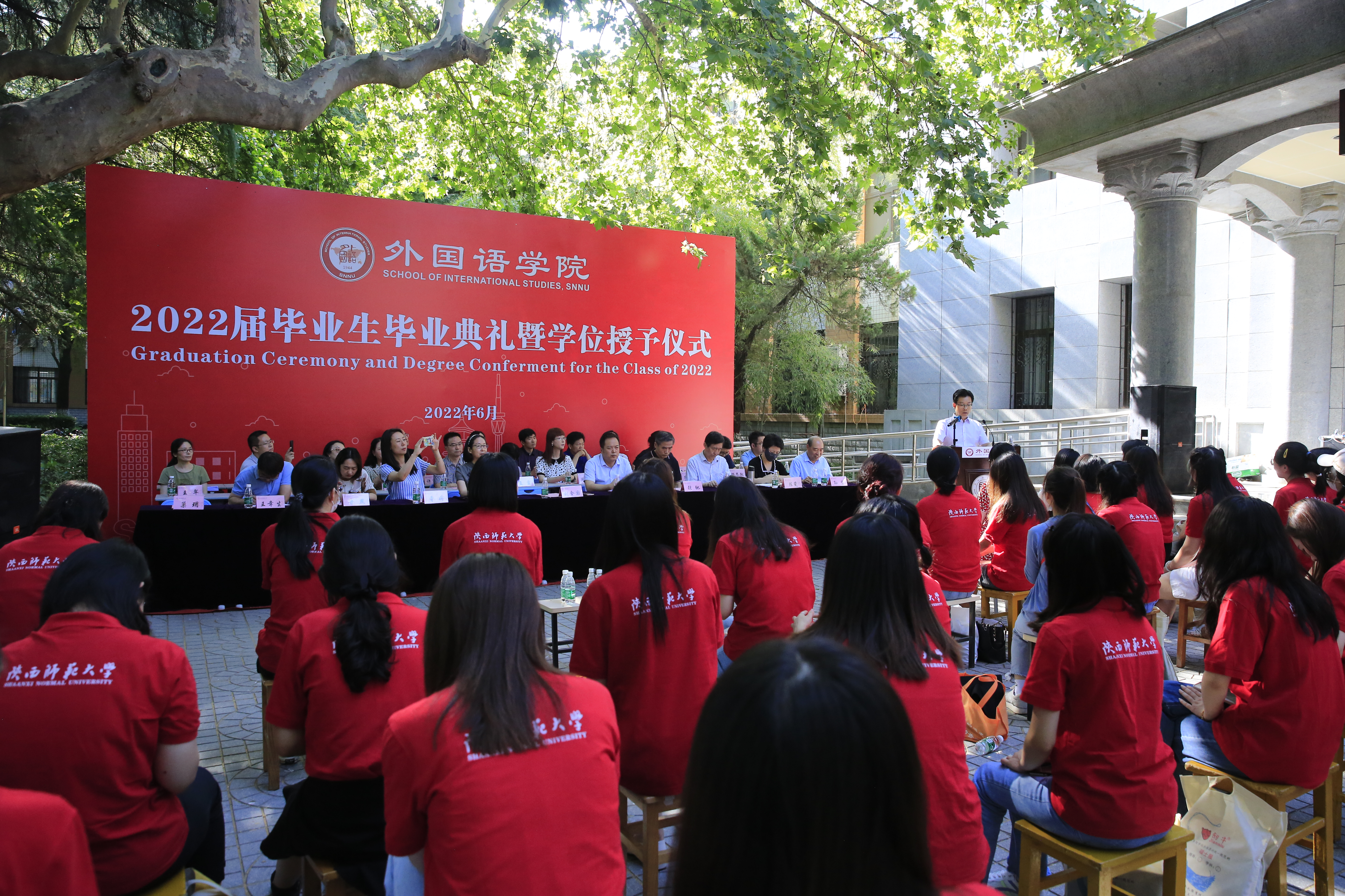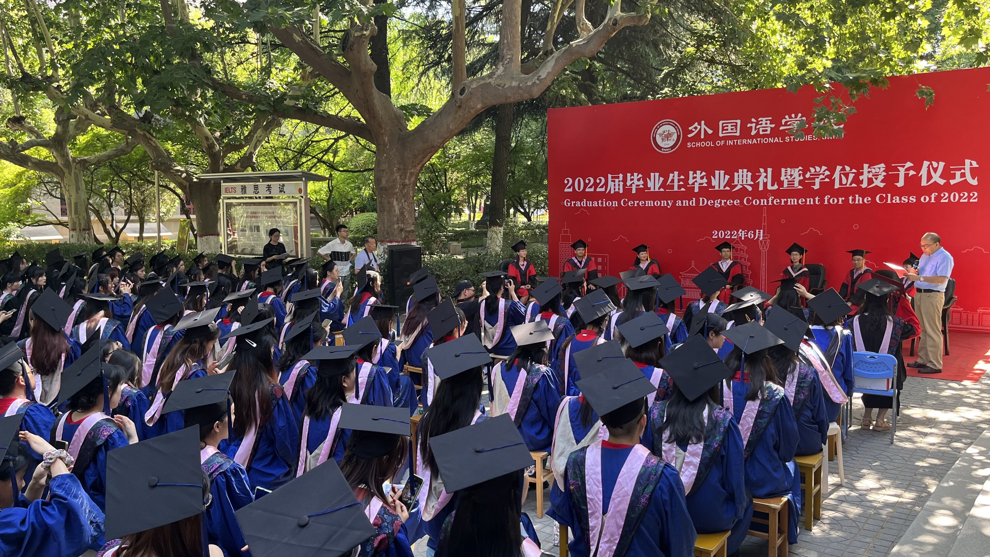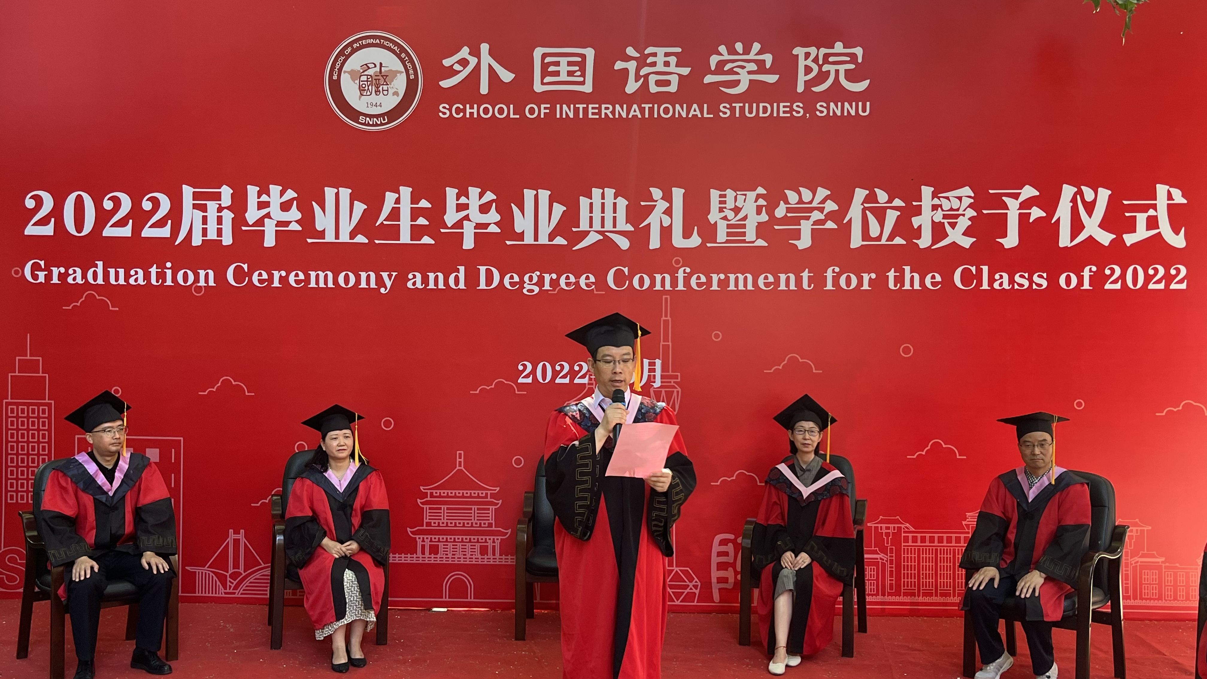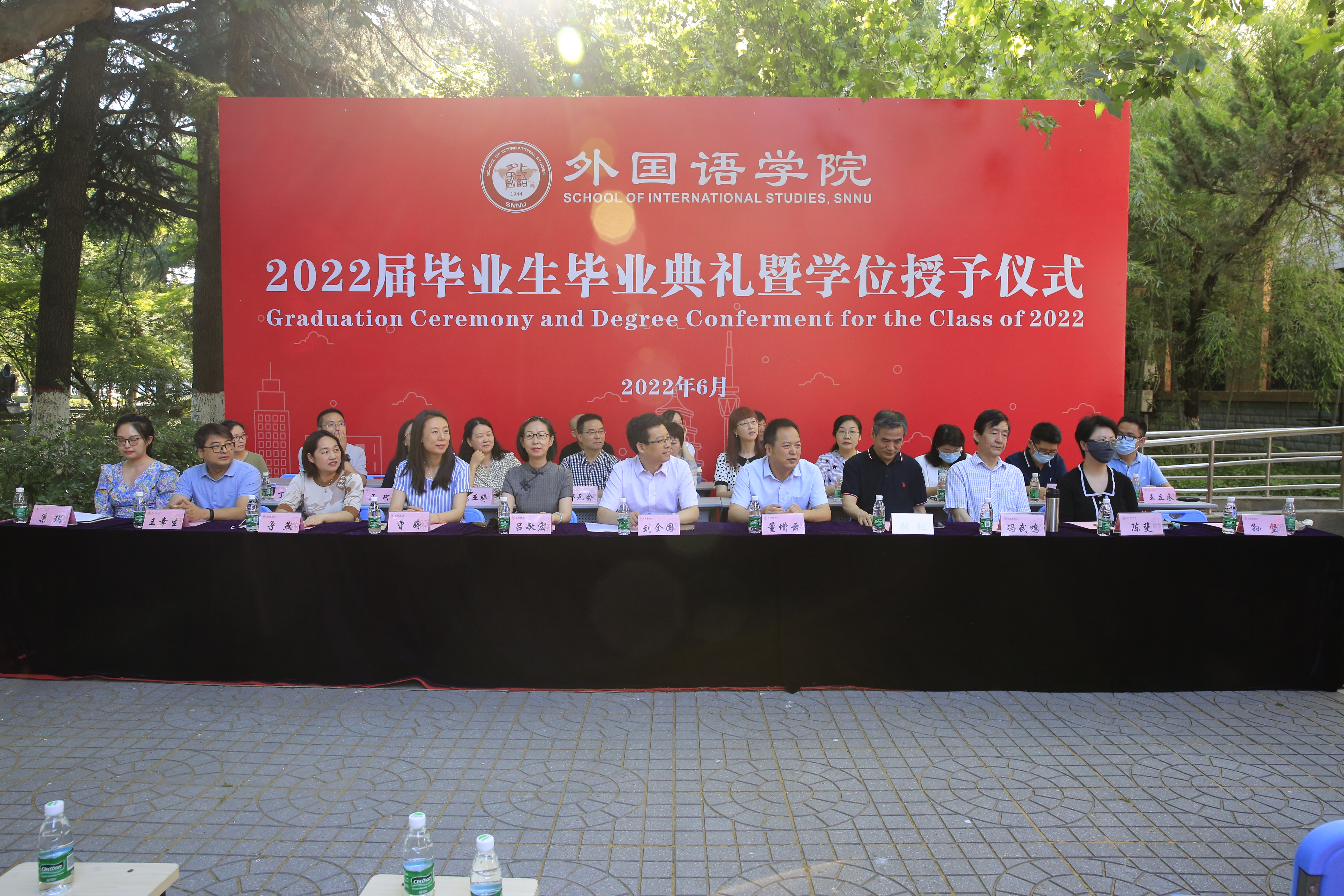 6月24日上午,365英国官网2022届学生毕业典礼暨学位授予仪式在教学六楼门前广场隆重举行,典礼同时在腾讯会议平台直播。365英国上市官网在线院长刘全国教授、党委书记董增云、学院前党委书记张弛、冯武鸣、副院长吕敏宏、曹婷、王幸生、党委副书记鲁燕、公共外语教学部主任马珂、英语系主任朱冬怡、副主任王立永、丁礼明、翻译系主任操林英、副主任杨冬敏、俄语系主任孟霞、副主任王翠、法语系副主任乔溪、日语系副主任许赛锋、学位委员会成员郑元会、张亚婷、魏军梅、办公室主任陈斐、语言语音教学中心主任邢俊升、团委书记李丹,以及全体辅导员出席典礼。典礼由365英国上市官网在线副院长孙坚教授主持。365英国官网2022届毕业生在学院领导和老师的共同见证下,拨穗正冠,开启人生新的旅程。