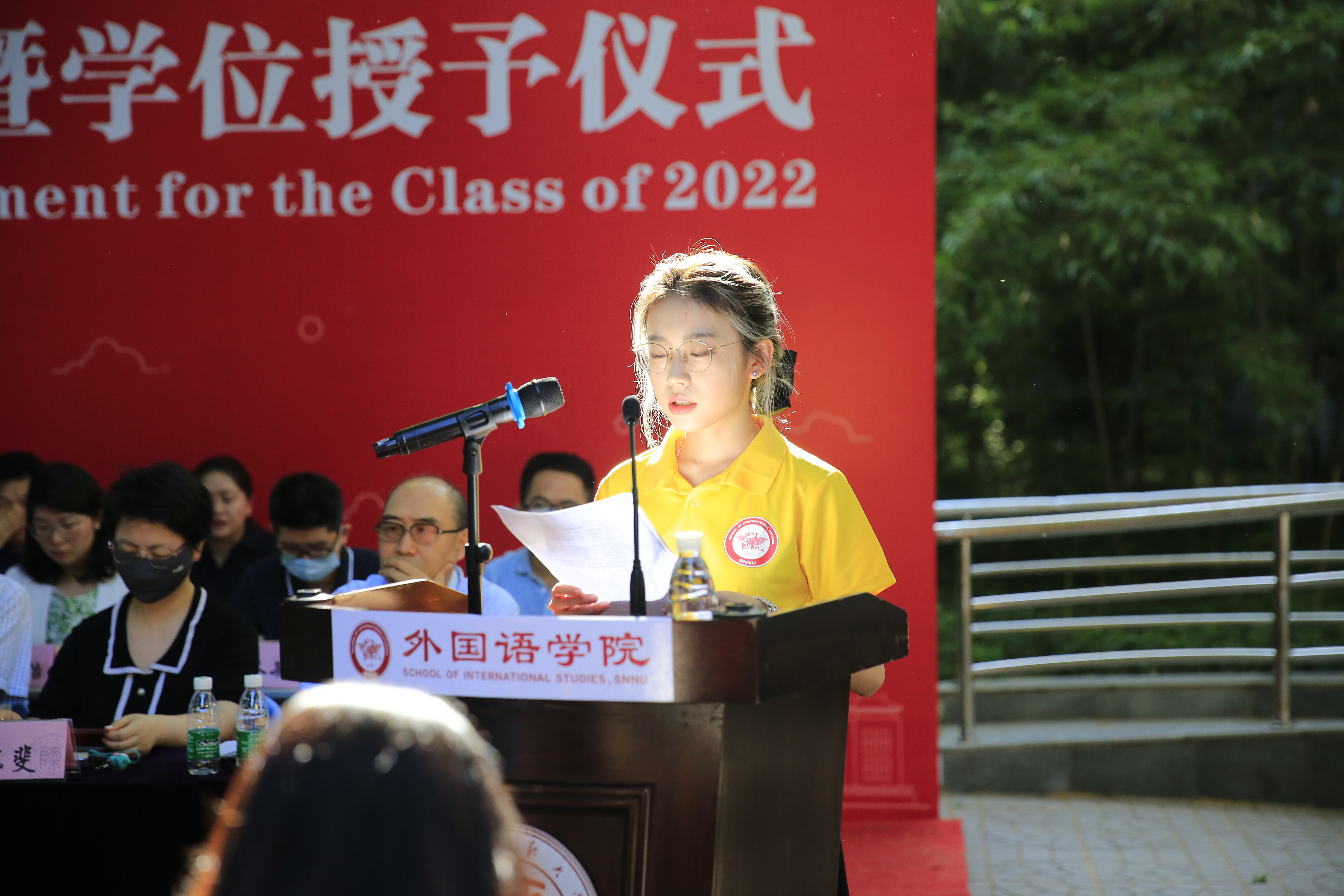 本科生代表、2018级日语专业的陈子淇同学即将赴外交学院深造。她表达了自己对于大学生活的不舍和对同学的深切的祝愿,以及努力作一名优秀的外语人,走向更广阔的世界的信念。