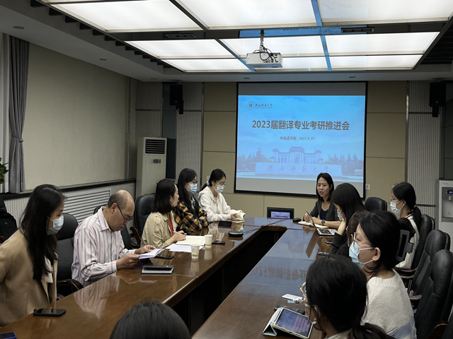 为进一步做好365英国官网本科生考研指导工作,帮助同学们解决备考期间遇到的困难,明确复习方向和规划,学院于9月27日上午在教学六楼一层会议室召开2023届本科生翻译专业考研推进会,副院长孙坚、党委副书记鲁燕、系主任操林英和系副主任杨冬敏参加会议。会议由辅导员老师屈婉婷老师主持。