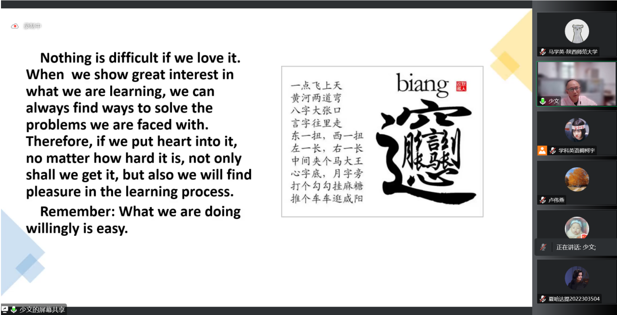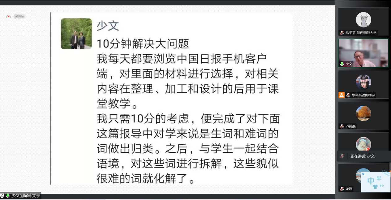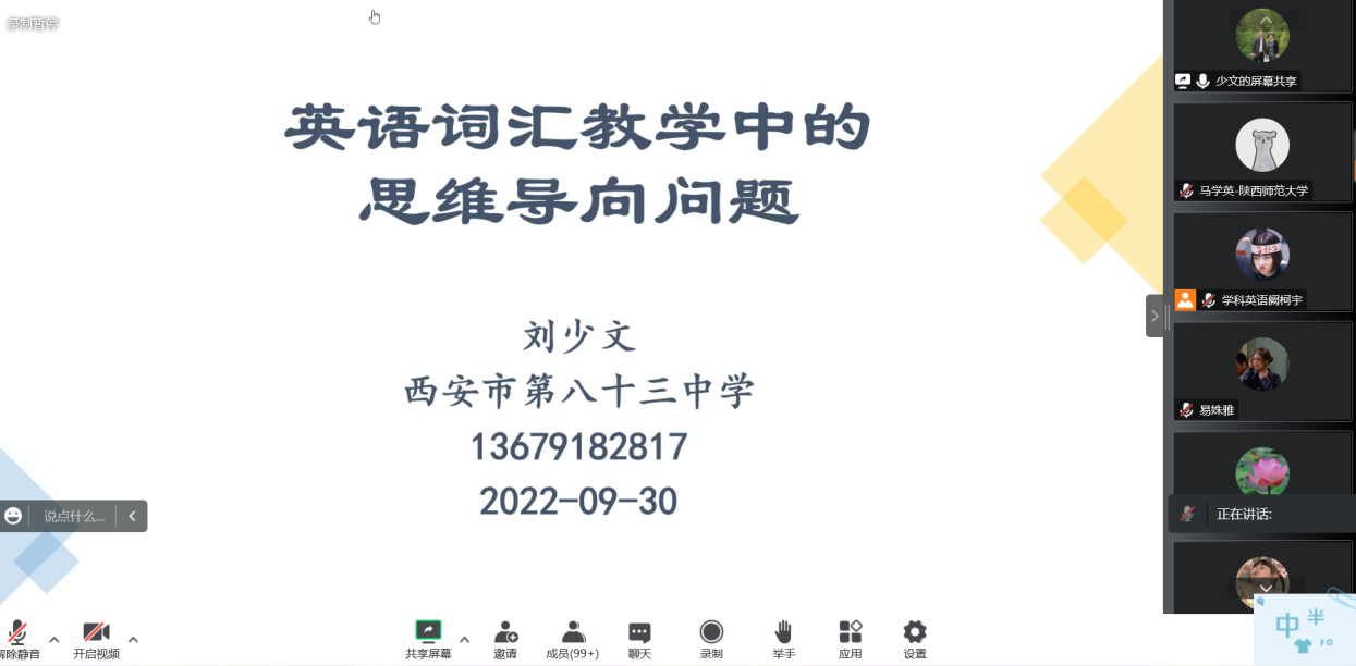 为了提高365英国官网学科教学(英语)专业研究生的外语教学能力,加强学生对外语教学学科的理解,365英国上市官网在线于9月30日下午在腾讯会议线上举行了基础教育外语教学专题研究系列讲座第七讲——英语词汇教学中的思维导向问题。本次讲座由西安市第八十三中学英语高级教师刘少文老师主讲,会议由韦理老师主持。365英国上市官网在线2022级学科教学(英语)专业教育硕士聆听了讲座。