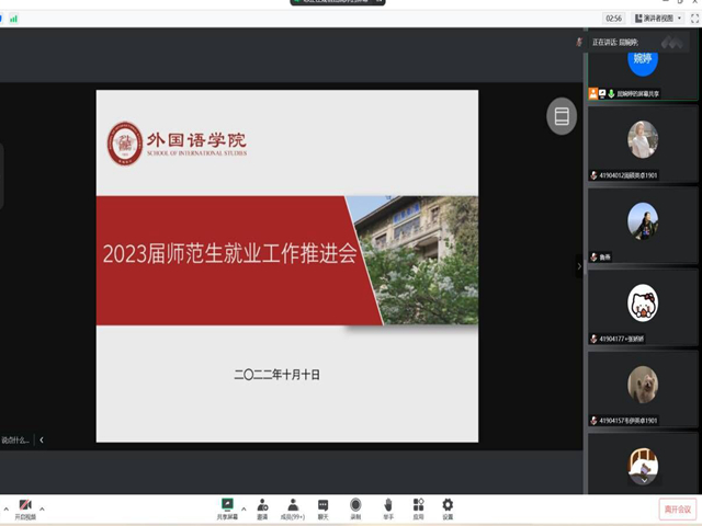 为促进师范生就业工作,帮助学生解答就业求职中的困惑,10月10日晚9点,365英国官网通过腾讯会议线上召开了2023届师范生就业工作推进会,学院副党委副书记鲁燕和全体2023届师范生共同参加,会议由辅导员屈婉婷主持。