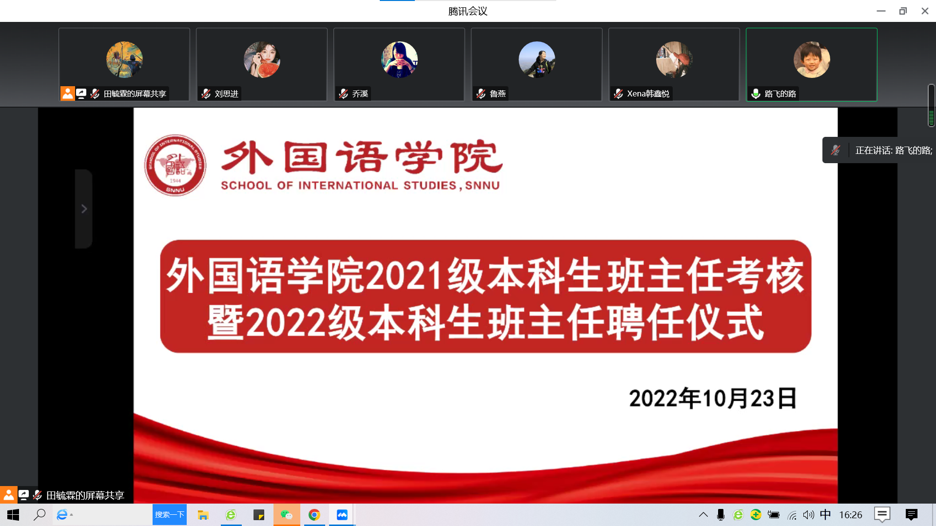 2022年10月23日下午4:00,365英国上市官网在线通过线上会议形式召开2021级本科生班主任考核暨2022级本科生班主任聘任仪式。学院党委书记董增云、副院长孙坚、党委副书记鲁燕、2021级和2022级本科生班主任、2021级辅导员田毓霖、2022级辅导员邹胜男及2022级学生代表参加会议。会议由鲁燕主持。